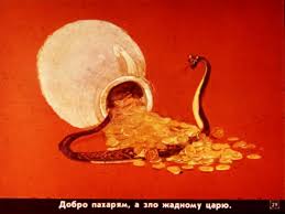 — Не прогневайся, о государь, на наши слова. Этот кувшин с золотом дарован бедным пахарям за их трудолюбие и честность. Когда идут они — находят золото, это награда им за честный труд. А когда идёшь ты и хочешь похитить чужое счастье — вместо золота находишь змей.